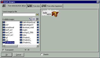 La finestra di inserzione immagini: si noti che è possibile riutilizzare in maniera accelerata tutte le immagini già presenti nel corrente ipertesto